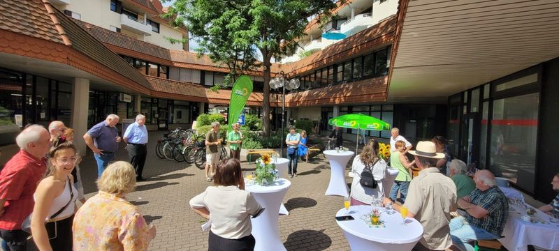Ein frisches grünes Ambiente bot sich den Gästen, liebevoll gestaltete Bistrotische, Sekt und Getränke, Quiche von der Biobäckerei bei Denns/Speyer, Kaffee, Brezeln, was das Herz begehrt.